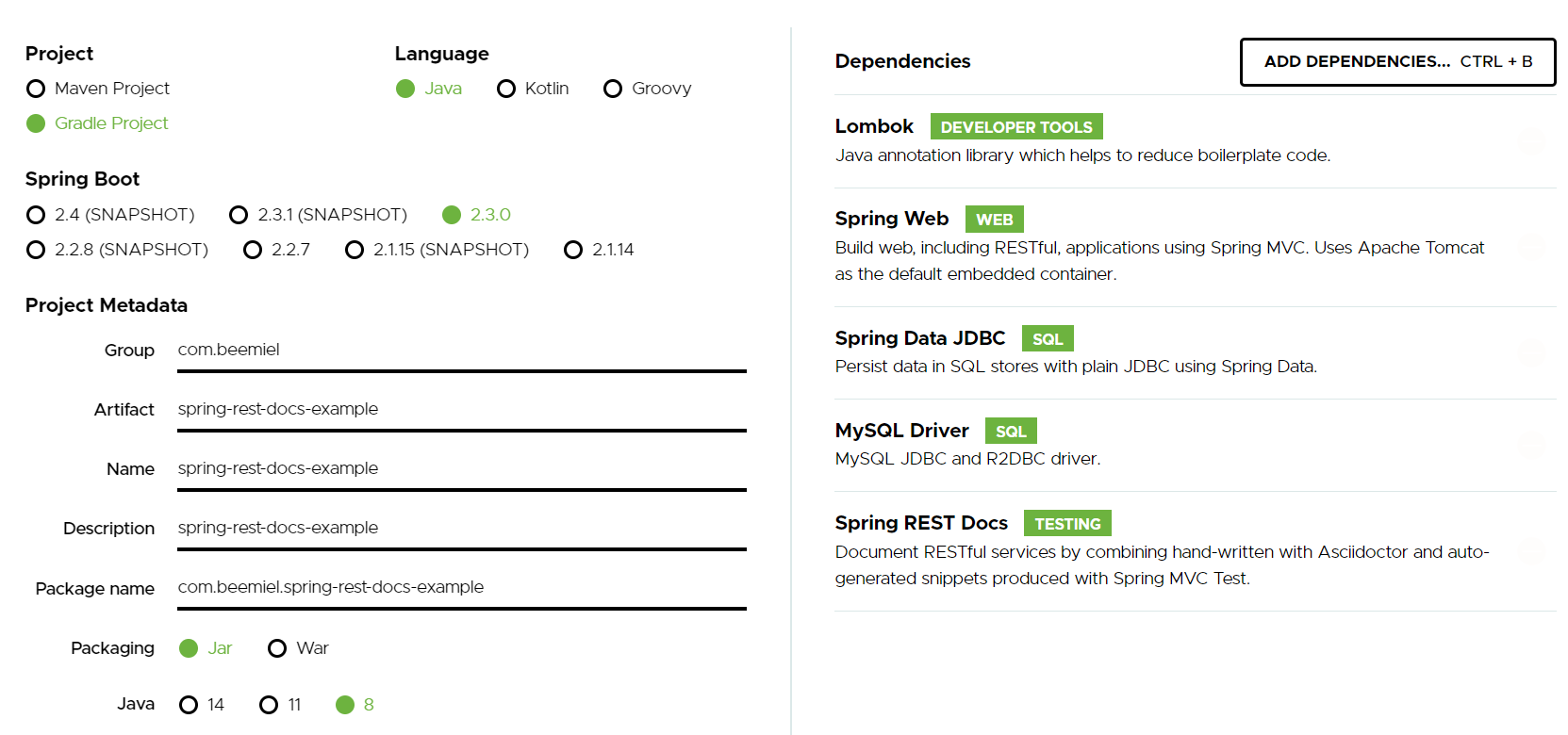 다른 항목들은 일반적인 프로젝트 세팅과 동일하고 Spring Web과 Spring REST Docs만 필수로 넣어주면 된다.