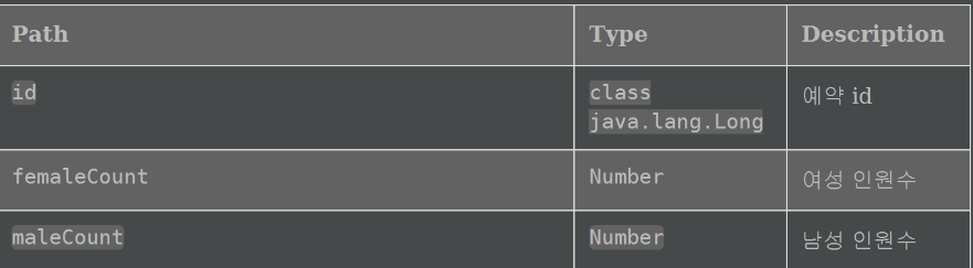 requestFields : request Body 값 설명