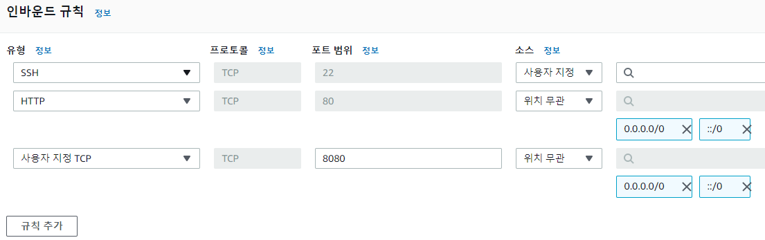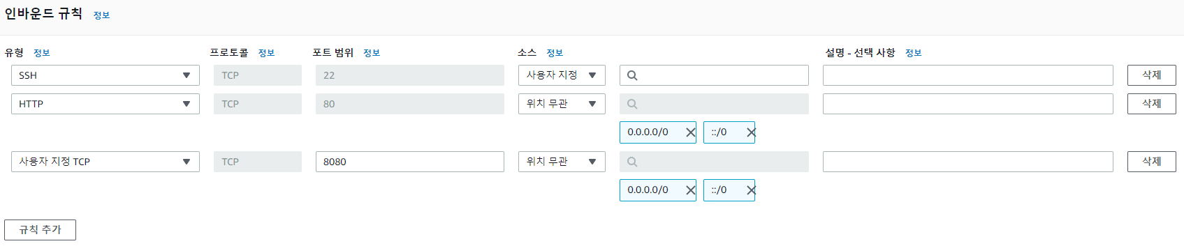 외부에서 ssh를 통해 EC2 인스턴스에 접속하기 위해 허용해줘야 한다.