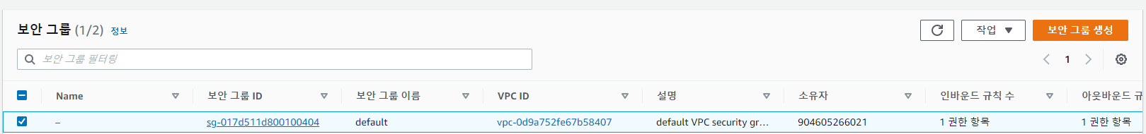 위에서 생성한 VPC의 기본 보안 그룹도 존재하고 있는 걸 볼 수 있다.