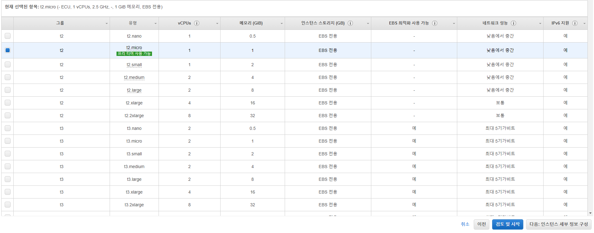 마찬가지로 프리티어라서 t2.micro 선택..^.ㅠ