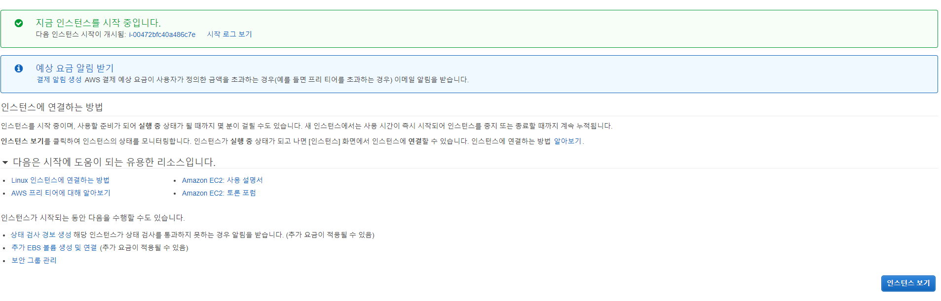 인스턴스 시작을 누르면 인스턴스가 생성이 돼서 부팅이 될 때까지 시간이 꽤 걸린다.