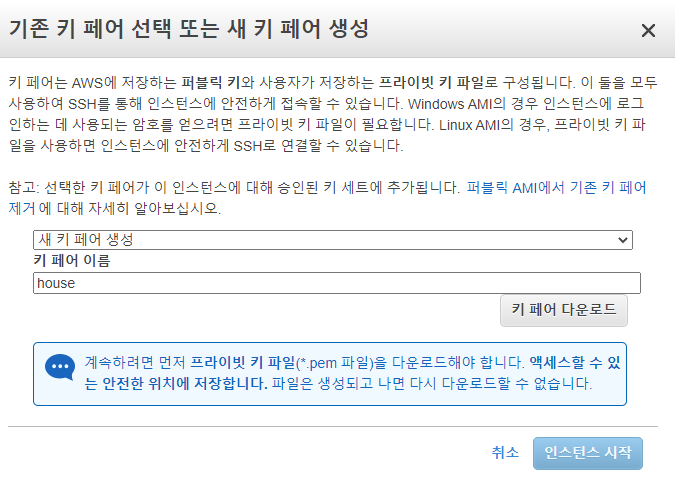 키 페어 다운로드를 하고 나면 [인스턴스 시작]이 활성화된다.