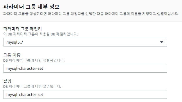 6. 우측 상단에 있는 [파라미터 그룹 생성] 선택 - 세부 정보는 아래 참고 - [생성]