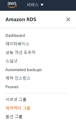 5. [RDS] - 왼쪽 메뉴 하단에 있는 [파라미터 그룹] 선택