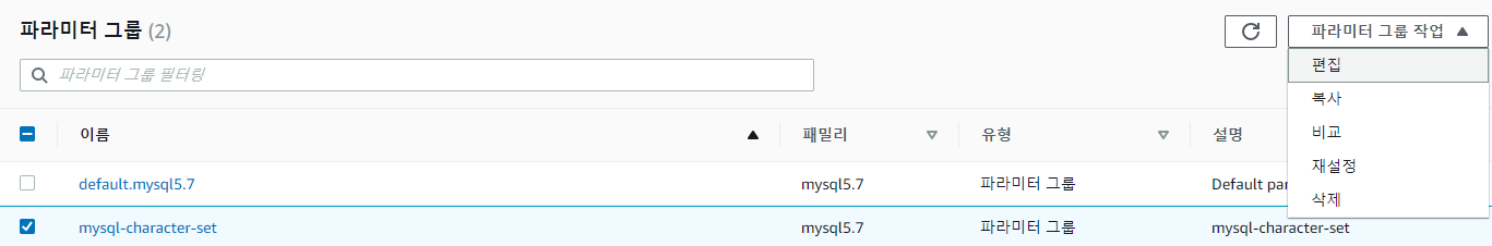 수정을 하고 나면 아래에서 파라미터 그룹을 확인할 수 있다.