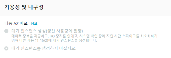 대기 인스턴스 생성을 선택하면 서로 다른 AZ에 각각 생성이 되고 데이터가 각각 저장이 된다.