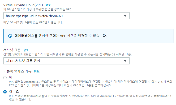 퍼블릭 액세스를 예로 선택하면 외부에서 RDS로 접근할 수 있는 상태가 된다.