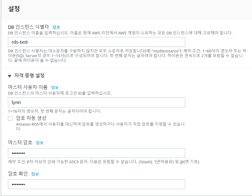 마스터 계정과 데이터베이스 이름은 RDS를 생성할 때 이미 위에서 모두 설정한 값들이다.