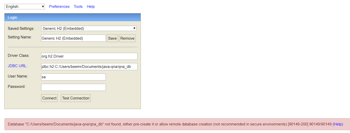 Database "C:/Users/beemi/Documents/java-qna/qna_db" not found, either pre-create it or allow remote database creation (not recommended in secure environments) [90149-200] 90149/90149 (Help)