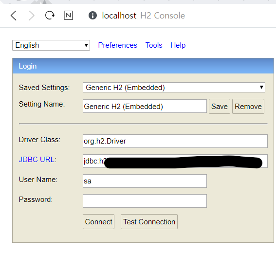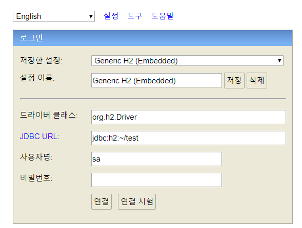 나는 공부용이라 사용자명과 비밀번호는 따로 입력하지 않았고 mv.db파일을 생설할 JDBC URL만 지정해줬다. 제네릭 ㅗ2 저 부분도 따로 손대지 않음.